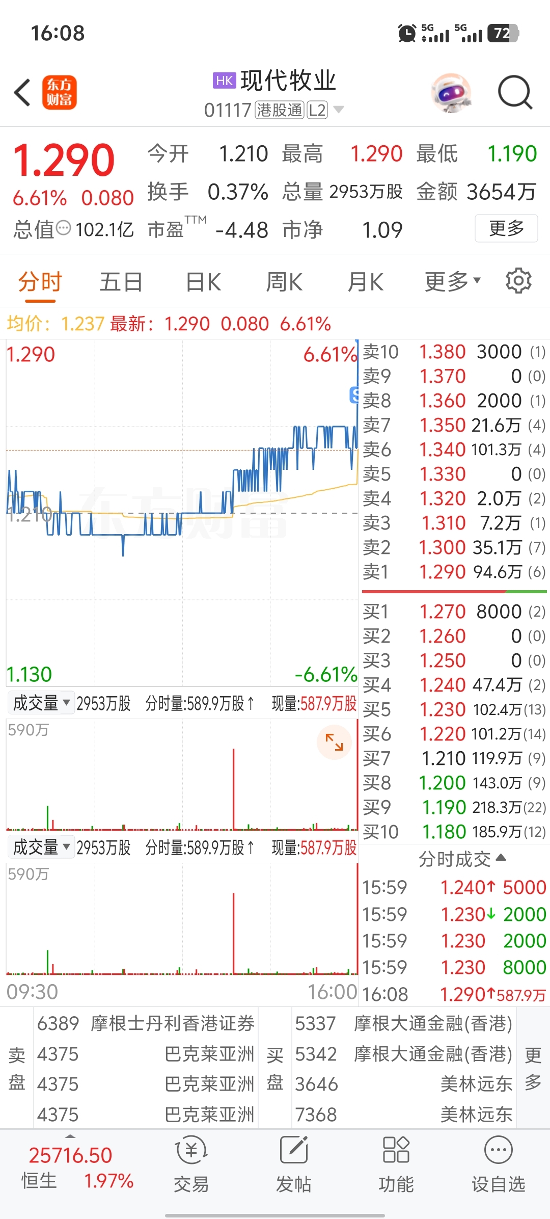 $现代牧业(HK|01117)$ 真牛,挂的1.29居然成交了