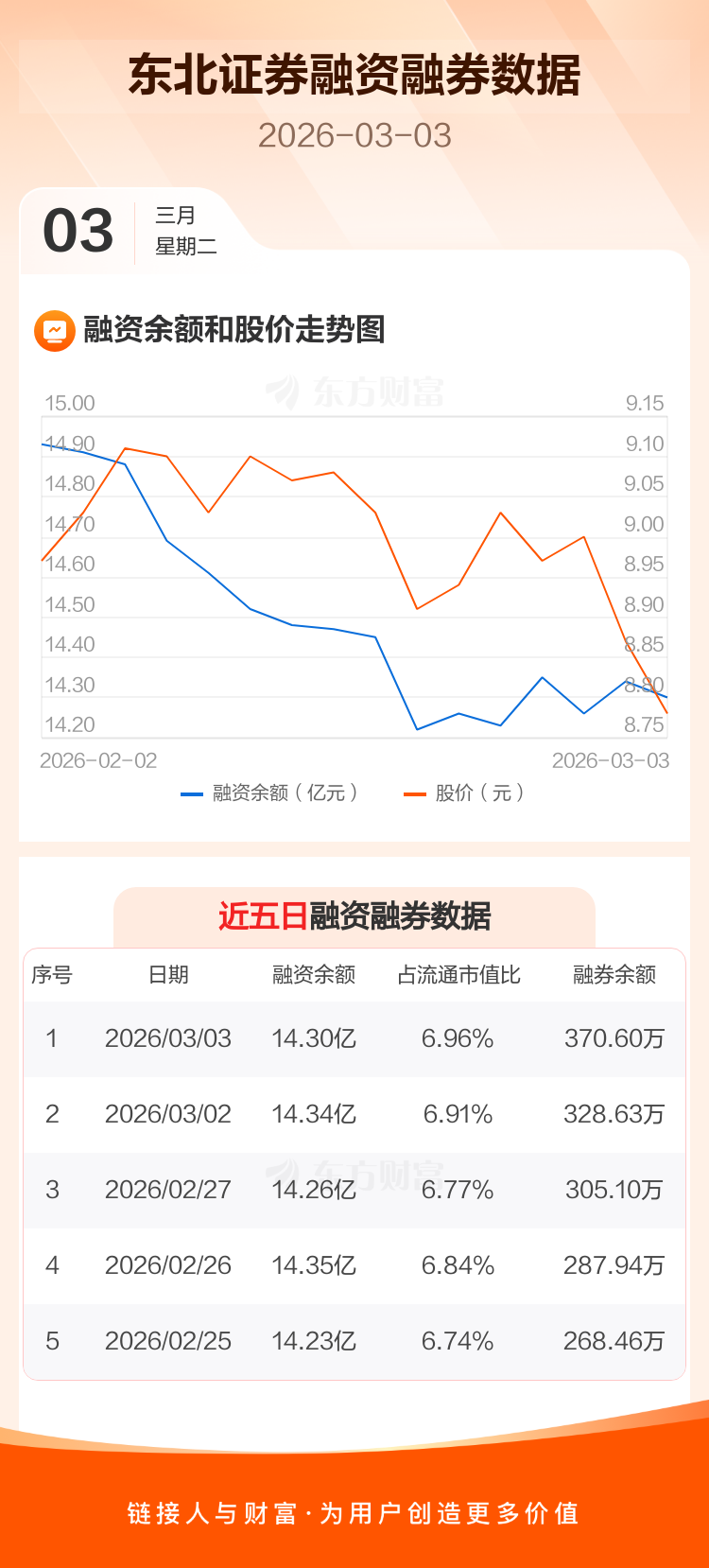 交易所最新数据显示,东北证券于2026年3月3日获融资买入3560.93万元,融资偿还3945.24万元,当日融资净偿还384.32万元。目前,该股融资余额14.30亿,占流通市值比例为6.96%。