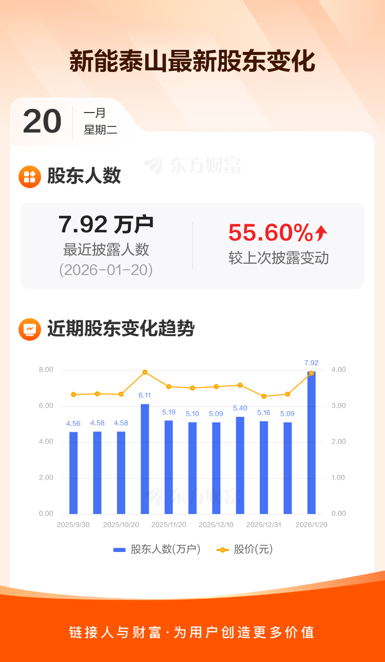 新能泰山:截至1月20日最新股东户数7.92万户,较上期增加55.60%