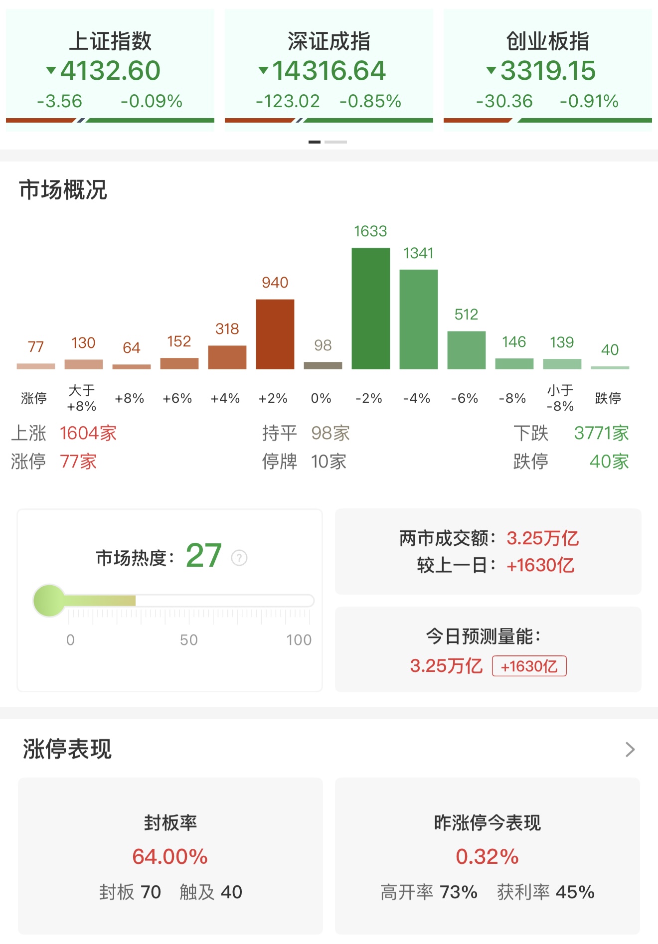 财联社1月26日电,市场全天震荡调整,大小指数分化明显,深成指、创业板指高开低走,盘中均跌超1%。沪深两市成交额3.25万亿,较上一个交易日放量1630亿。盘面上,市场热点较为杂乱,全市场超3700只个股下跌。从板块来看,有色金属板块涨幅居前,其中贵金属概念领涨,四川黄金8天4板,晓程科技、湖南黄金、盛达资源等多股涨停,紫金矿业创历史新高。油气概念走强,中国海油创历史新高,洲际油气4天3板。太空光伏概念反复活跃,明阳智能、拓日新能、协鑫集成涨停。化工板块震荡拉升,红宝丽、澄星股份涨停。下跌方面,商业航天、半导体设备等板块跌幅居前。其中多只商业航天概念股大跌,中国卫通、中国卫星跌停。截至收盘,沪指跌0.09%,深成指跌0.85%,创业板指跌0.91%。