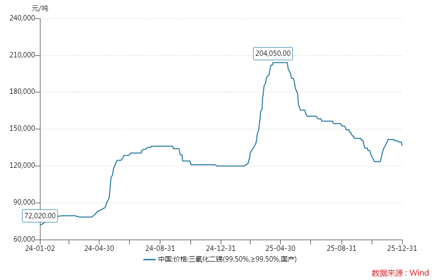 Wind数据显示,2025年上半年国产三氧化二锑(99.5%,≥99.5%)平均价为16.1万元/吨,下半年则降至14.5万元/吨左右。