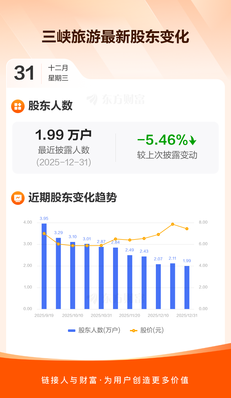 三峡旅游最新披露数据显示,截至12月31日公司股东户数为1.99万户,较上期(2025年12月19日)减少1152户,降幅为5.46%。户均持有流通股数量由上期的3.40万股上升至3.59万股,户均持股金额由上期的26.64万元增加至26.67万元。