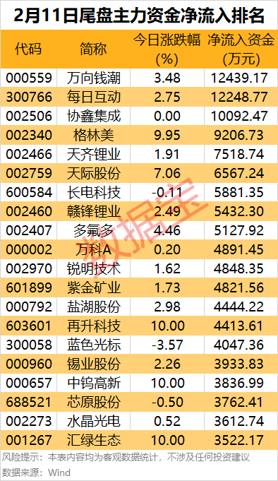 协鑫集成、格林美、天齐锂业、天际股份、长电科技和赣锋锂业等尾盘主力资金净流入均超5000万元。