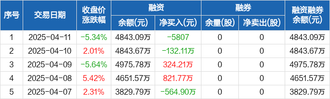 长华化学:融资净偿还5807元,融资余额4843.09万元(04-11)
