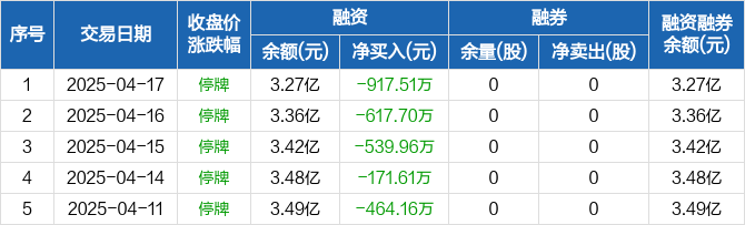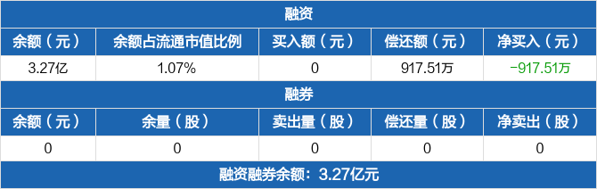 融资方面,当日融资买入0元,融资偿还917.51万元,融资净偿还917.51万元,连续14日净偿还累计11.9亿元。融券方面,融券卖出0股,融券偿还0股,融券余量0股,融券余额0元。融资融券余额合计3.27亿元。