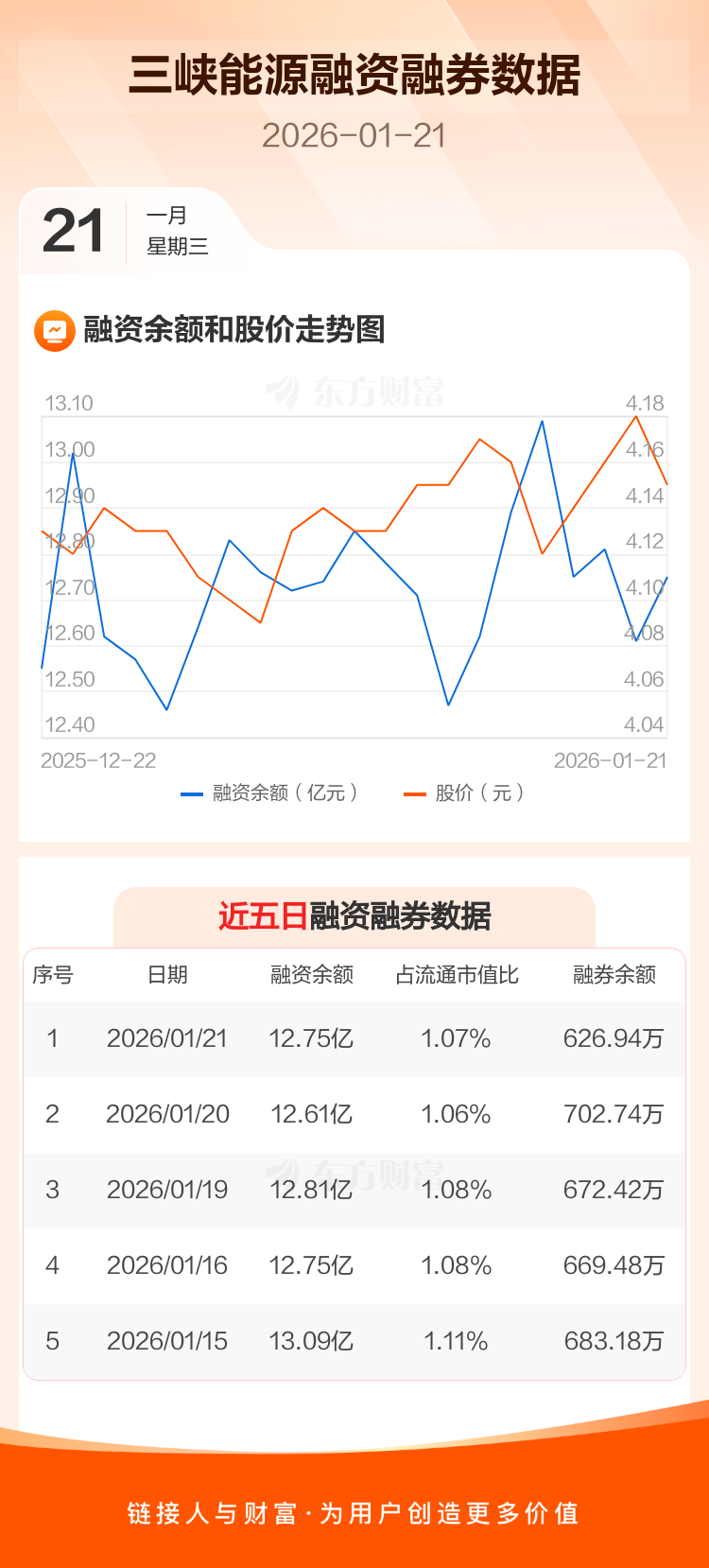 交易所最新数据显示,三峡能源于2026年1月21日获融资买入6143.36万元,融资偿还4795.67万元,当日融资净买入1347.69万元。目前,该股融资余额12.75亿,占流通市值比例为1.07%。