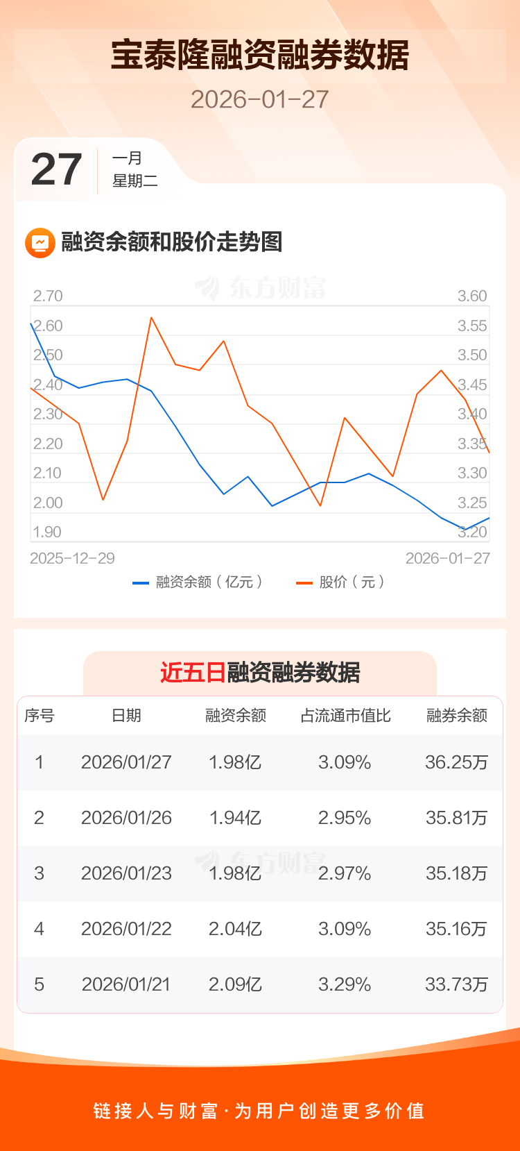 交易所最新数据显示,宝泰隆于2026年1月27日获融资买入1315.47万元,融资偿还933.94万元,当日融资净买入381.53万元。目前,该股融资余额1.98亿,占流通市值比例为3.09%。