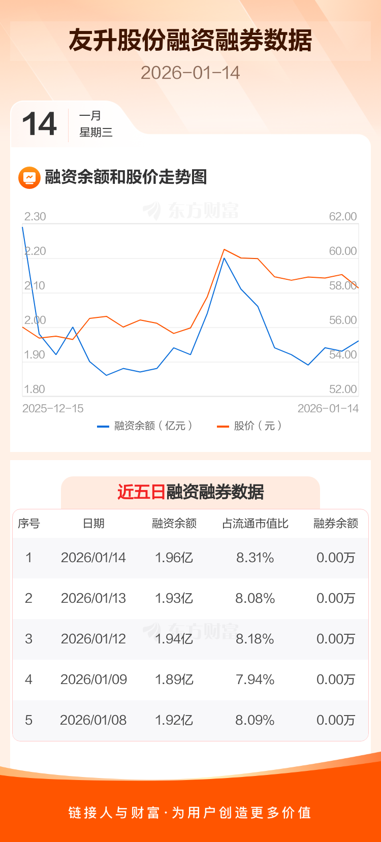 交易所最新数据显示,友升股份于2026年1月14日获融资买入2827.75万元,融资偿还2545.11万元,当日融资净买入282.64万元。目前,该股融资余额1.96亿,占流通市值比例为8.31%。