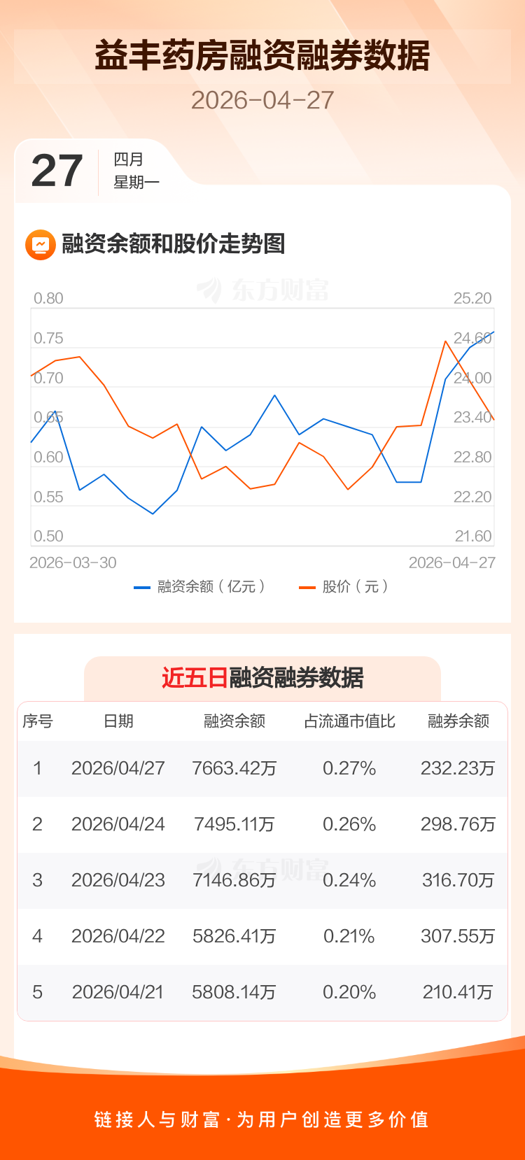 交易所最新数据显示,益丰药房于2026年4月27日获融资买入1317.05万元,融资偿还1148.74万元,当日融资净买入168.31万元。目前,该股融资余额7663.42万,占流通市值比例为0.27%。