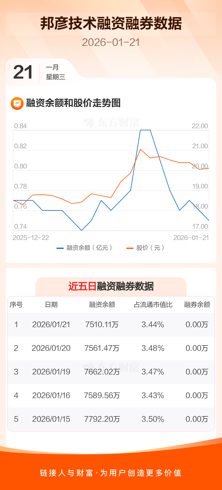 交易所最新数据显示,邦彦技术于2026年1月21日获融资买入226.27万元,融资偿还277.63万元,当日融资净偿还51.36万元。目前,该股融资余额7510.11万,占流通市值比例为3.44%。