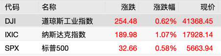 美东时间周四(8日),美国三大股指集体收涨。截至当天收盘,道琼斯工业平均指数比前一交易日上涨254.48点,收于41368.45点,涨幅为0.62%;标准普尔500种股票指数上涨32.66点,收于5663.94点,涨幅为0.58%;纳斯达克综合指数上涨189.98点,收于17928.14点,涨幅为1.07%。中概股多数收涨,纳斯达克中国金龙指数涨近1%。