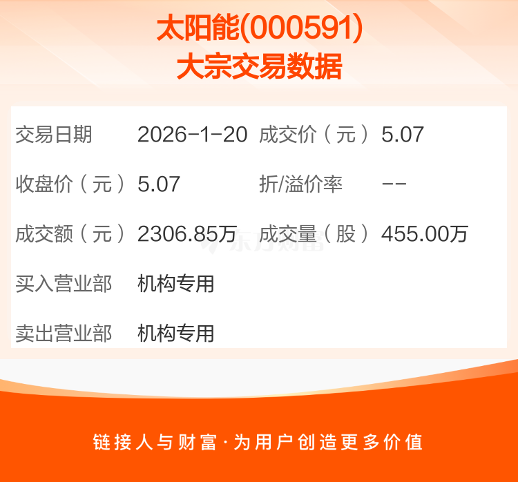 2026年1月20日,太阳能发生1笔大宗交易,共成交455.00万股,成交金额2306.85万元,占其流通市值比例为0.12%。