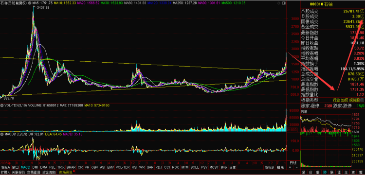 通达信数据显示:当天石油指数开盘暴涨8.94%,随后单边下跌,多方除了在10点19分至10点50分有过短暂抵抗外,几乎完全被空方“碾压”。终盘,石油指数涨幅仅为3.20%,报1734.90点。