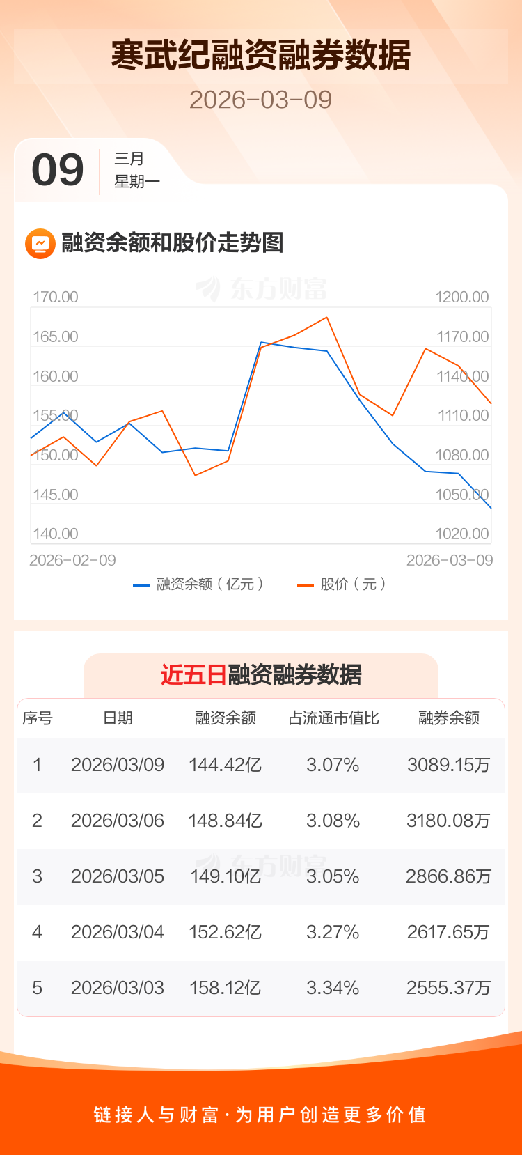 交易所最新数据显示,寒武纪于2026年3月9日获融资买入4.43亿元,融资偿还8.85亿元,当日融资净偿还4.42亿元。目前,该股融资余额144.42亿,占流通市值比例为3.07%。