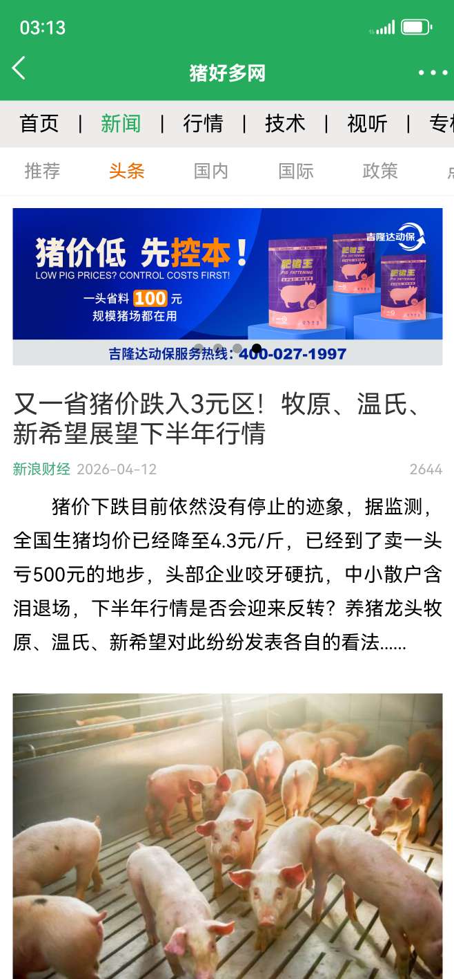 $生猪2605(DCE|lh2605)$ 广西跌入3元区间