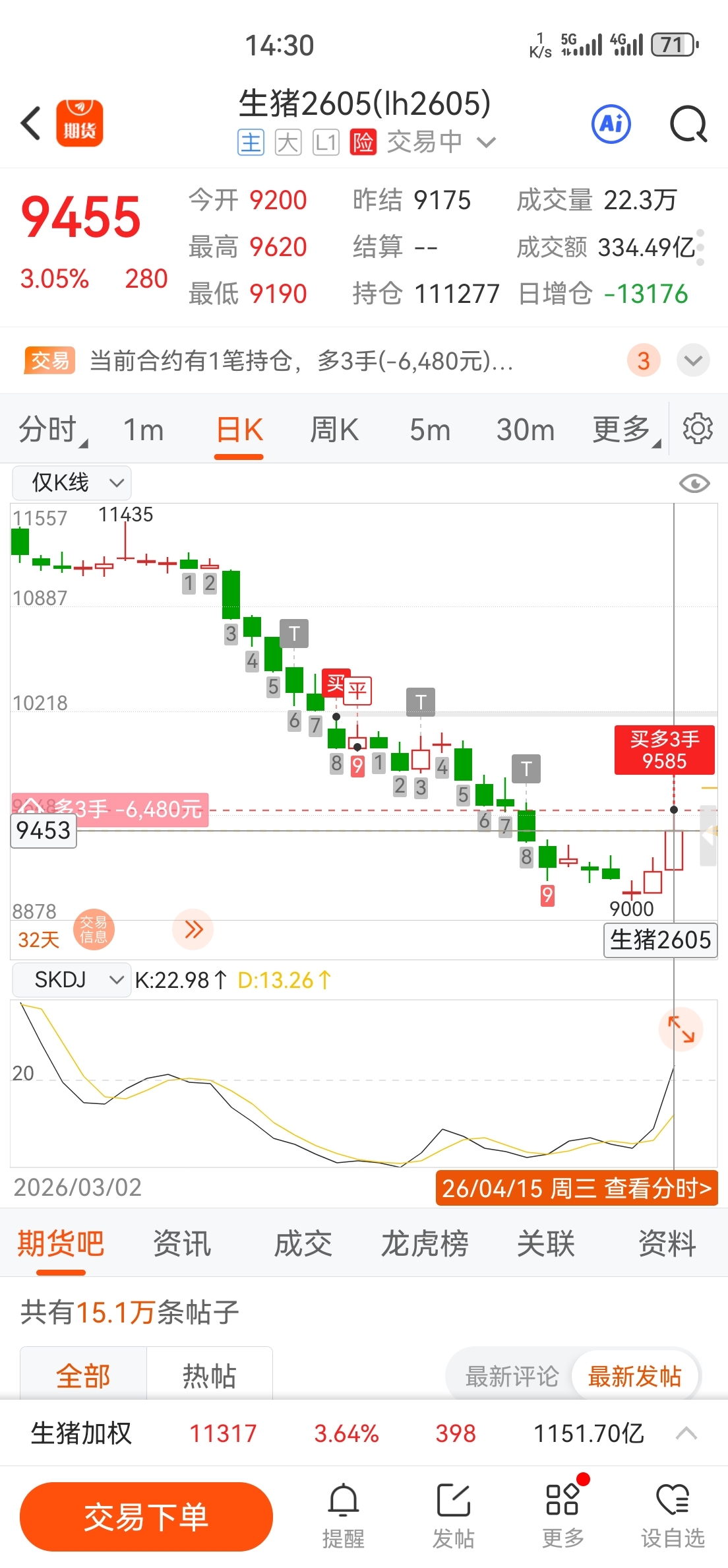 $生猪2605(DCE|lh2605)$ 为什么05和07差两个点,又把我套山顶了,不涨只有尾盘割了