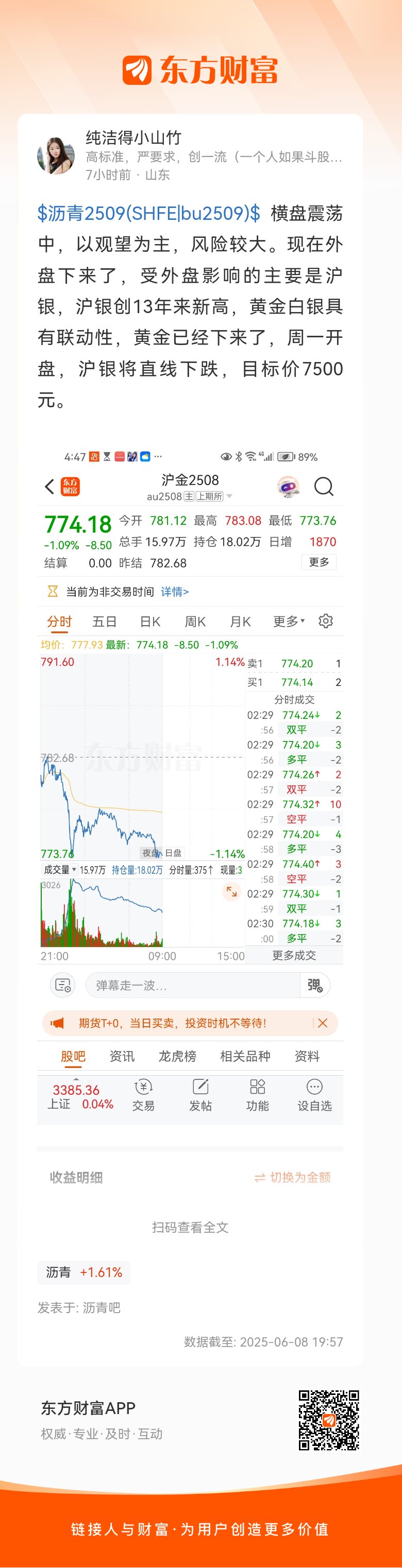 $沥青2509(SHFE|bu2509)$ 横盘震荡中,以观望为主,风险较大。现在外盘下来了,受外盘影响的主要是沪银,沪银创13年来新高,黄金白银具有联动性,黄金已经下来了,周一开盘,沪银将直线下跌,目标价7500元。