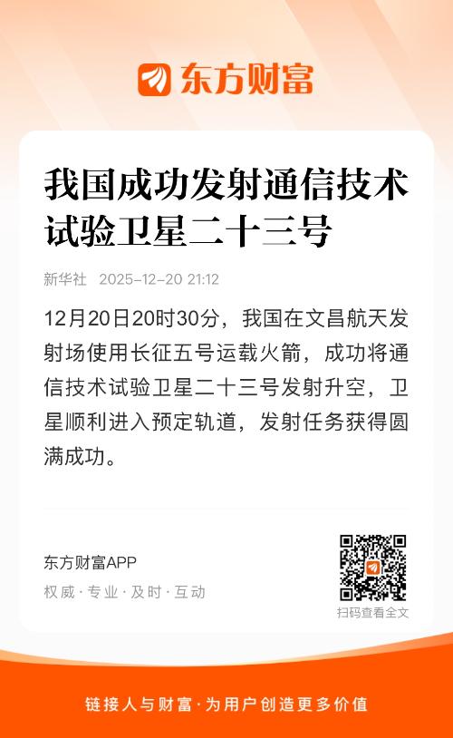 12月20日20时30分,我国在文昌航天发射场使用长征五号运载火箭,成功将通信技术试验卫星二十三号发射升空,卫星顺利进入预定轨道,发射任务获得圆满成功。