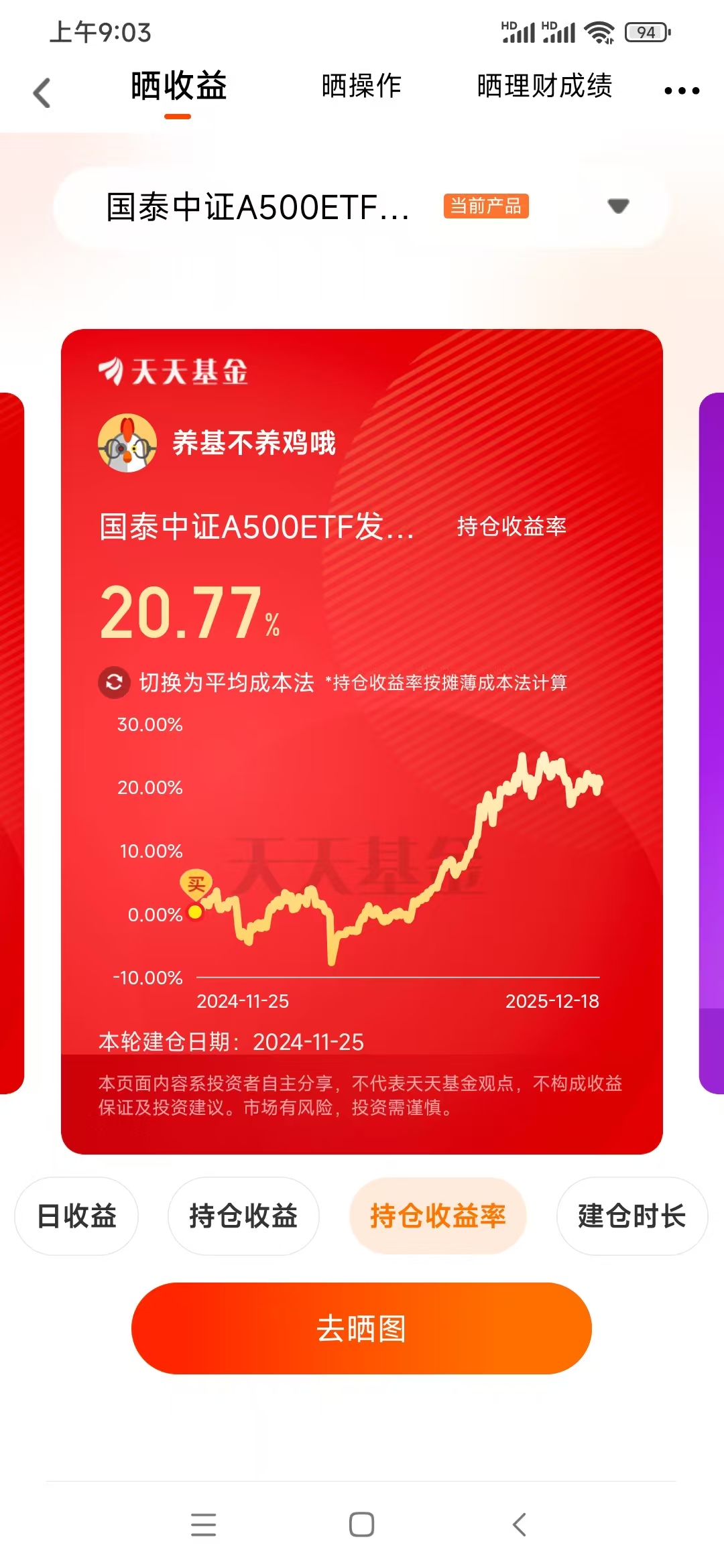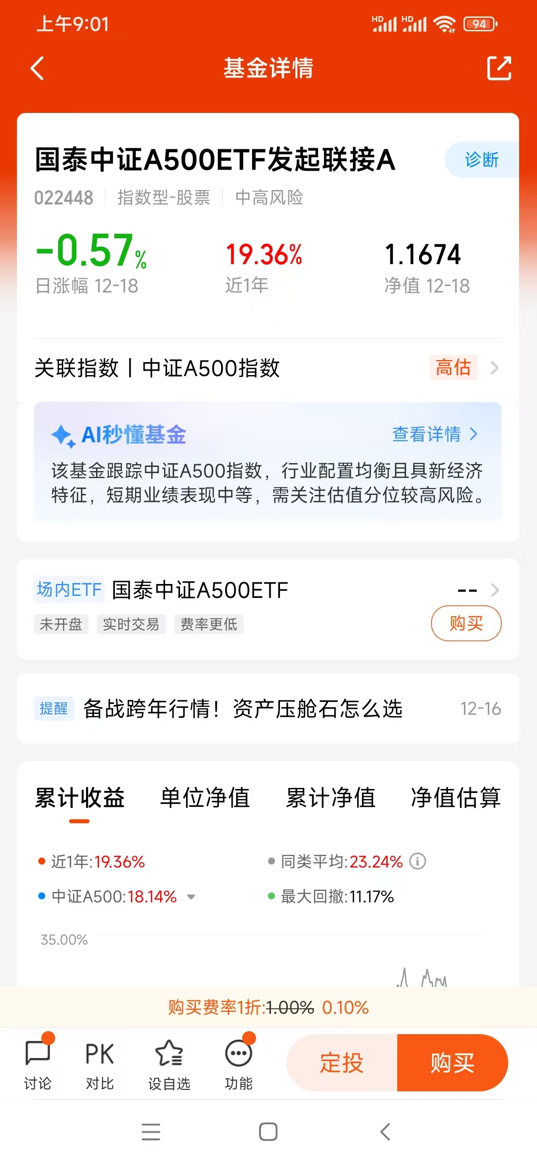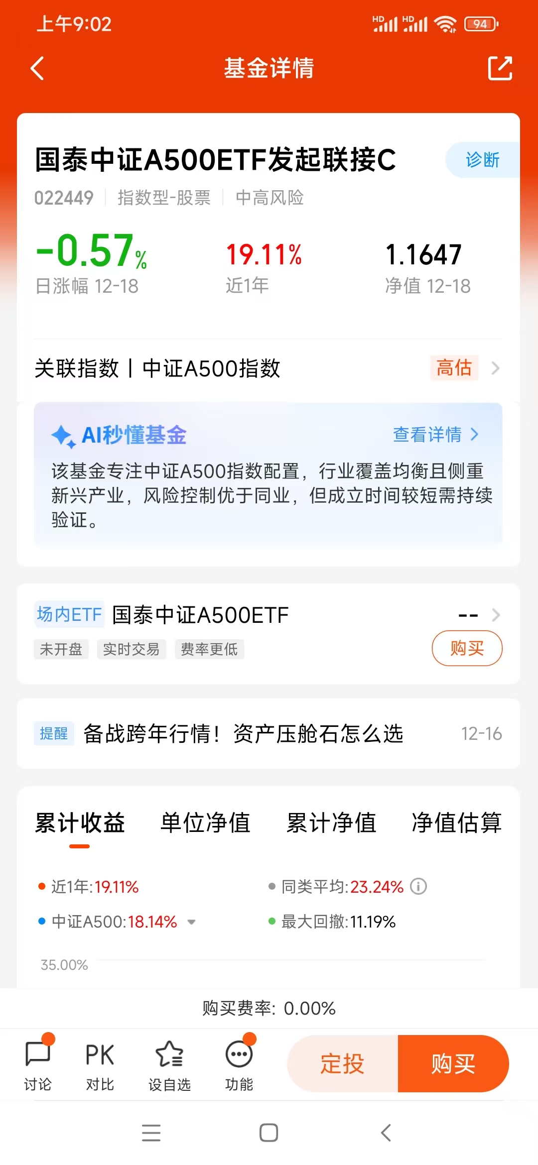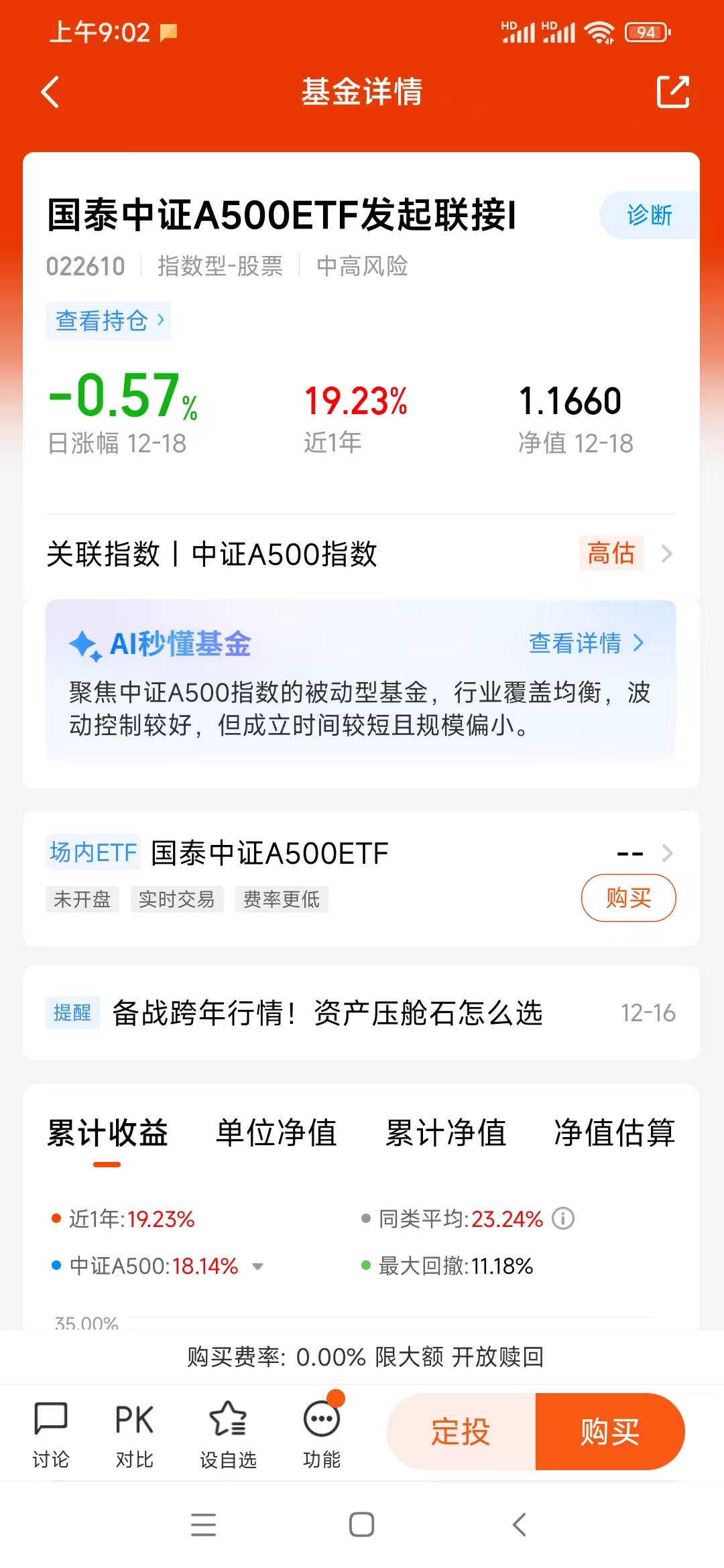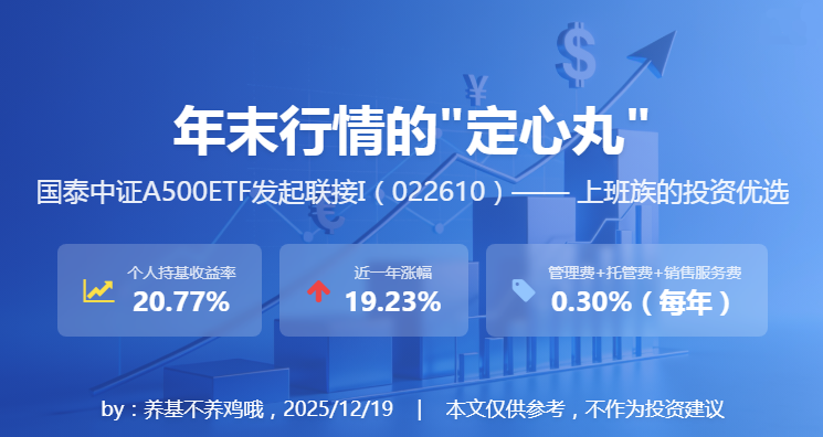 年末行情总是让人又爱又恨,想加仓怕踩坑,空仓又怕错过跨年红利。平时工作较忙,所以我选基金的逻辑特别简单:不费神、成本低、潜力足、够靠谱。而手里持有一年多的国泰中证A500ETF发起联接I(022610),就是我压箱底的“定心丸”,不仅拿下了20.77%的持基收益率,更让我在市场波动里睡得踏实。(关注及自选图在文末哦)