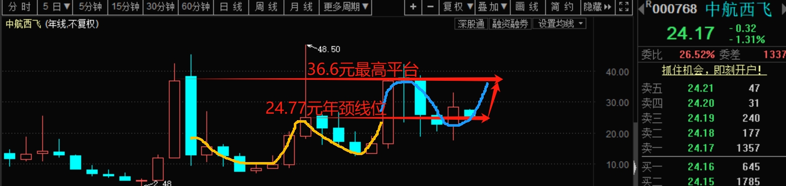 中航西飞年K图节奏感很强,突破回踩年颈线位。